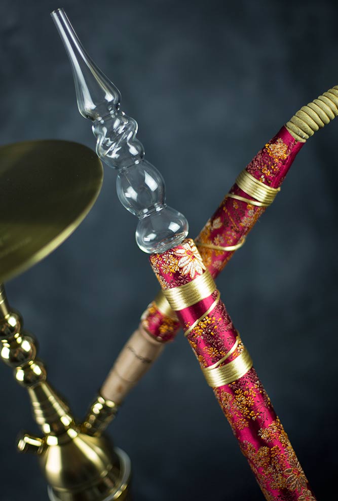 aljamal veredelt / produziert diese Ziegenlederschläuche mit viel Hingabe und Kreativität in Handarbeit, jeder Lederschlauch ist ein Unikat. Ein aljamal Borosilikat Glasmundstück setzt dem ganzen dann noch die "Krone" auf.