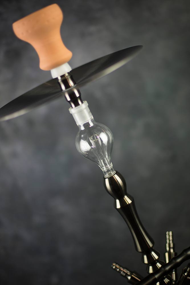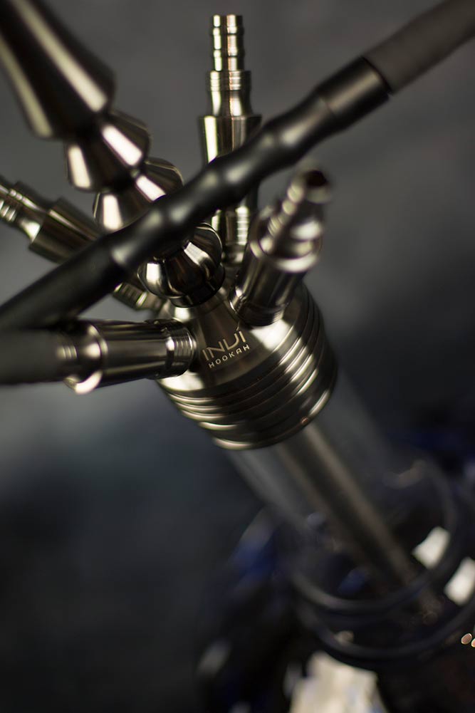 INVI Tesseract Edelstahl Gun Metal Blue Ice, alles dabei, was man sich nur wünschen kann. Eine Bowl mit den farblichen Akzenten, der enthaltene Kaminaufsatz für einen einfachen Kopfbau, mit bis zu vier Schlauchadapter sowie -anschlüsse kann die Pfeife auch mit mehreren geraucht werden. Der Molassefänger verhindert Verschmutzungen durch überlaufende Molasse, das erleichtert natürlich das Reinigen der Invi Shisha. Das Tauchrohr kommt mit einem abnehmbaren Diffusor, ideal für die Rauchsession vor dem Fernseher.