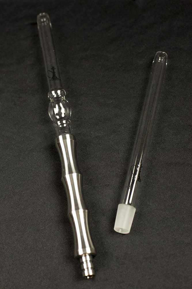 Das Set besteht aus einem Metallgriff sowie einem Glasaufsatz in einer extravagante Form ("Bubble" oder "Squirl").