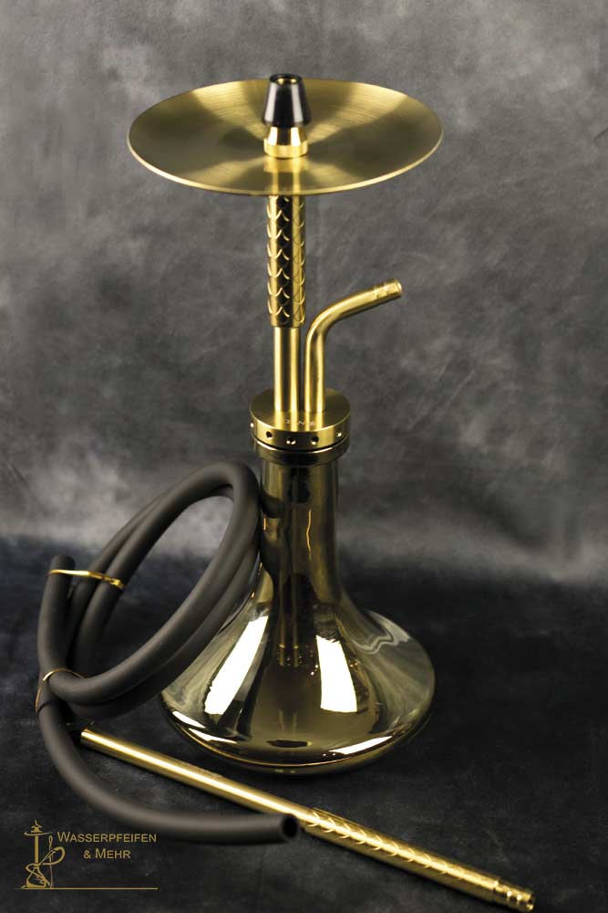 Ocean Hookah Cane "S" Small Gold / Gold Chrome, another with a funny blow-out system above the base. Small mobile hookah (height 45cm) ideal to take along or also as a table hookah. High-quality workmanship with a lot of accessories included and the whole thing also at a very good price.